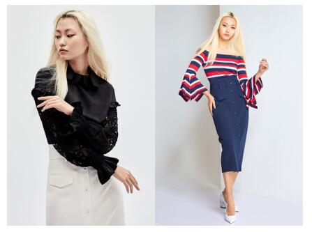 简单大方的露肩上衣, 有着荷叶边的浪漫滚边设计与喇叭袖型, 举手投足展现自信风采,轻松为职装增添优雅女人味。