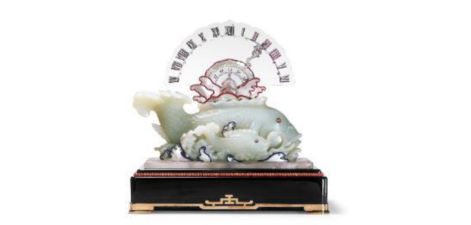 玉鲤鱼来自19世纪的中国。在玉雕双鱼座上置扇形时钟,珍珠母贝表盘,其海水江崖式的造型灵感来自中国龙袍的装饰纹样,意为江山永固;时钟的指针装饰一小龙,既灵动活泼,又与中国流传最为广泛的吉祥祝语“鲤鱼跃龙门”完美契合:鲤鱼努力拼搏越过海水,升腾化而为龙,这在中国寓意成功逆袭、高升发达,寄托了人们最为普遍的人生期盼。时间与永恒,鲤鱼、海水到龙的升华,艺术家对异域文化的精准理解和超凡创造力,成就了形式与内容的完美统一。