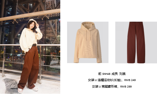 刘灜的这一身穿搭很适合周末与三五好友相约一聚,暖暖的米黄色短版抽绳连帽卫衣,柔软的优质棉面料,搭同色系帽子俏皮又不失可爱,下装搭配焦糖色系的廓形宽腿裤瞬时拉出高挑身形,同时将前襟微束进裤腰又丰富了穿搭时尚感。