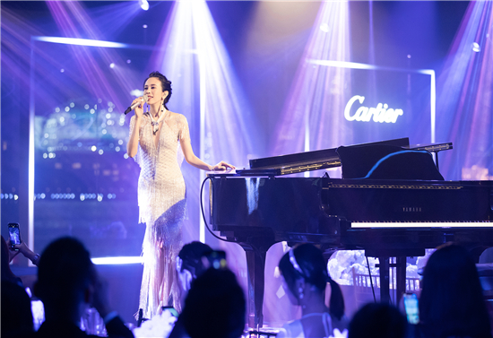 图5-10:卡地亚品牌挚友、全球知名华语女歌手莫文蔚出席晚宴并带来精彩演出,佩戴卡地亚猎豹系列高级珠宝项链、手镯、耳环、卡地亚高级珠宝系列Benares钻石戒指