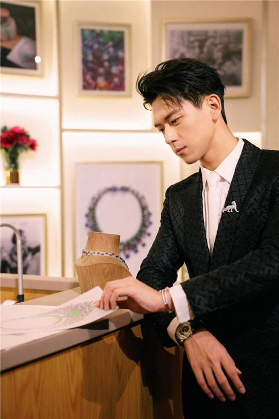 图61-65:青年演员李现参观卡地亚高级珠宝展,佩戴Rotonde de Cartier双重神秘陀飞轮镂空腕表、卡地亚猎豹系列高级珠宝胸针、卡地亚Juste un Clou系列手镯