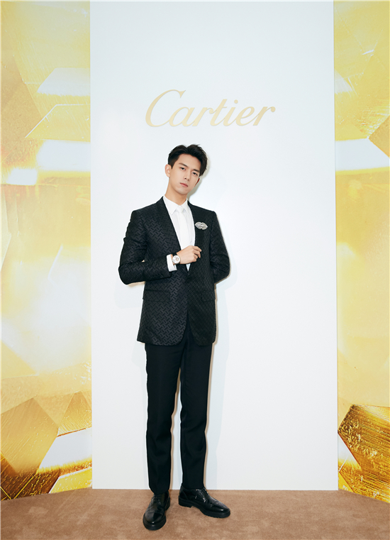 图29-31:青年演员李现出席晚宴,佩戴Rotonde de Cartier神秘小时镂空腕表、卡地亚古董珍藏系列双夹扣棕榈叶胸针