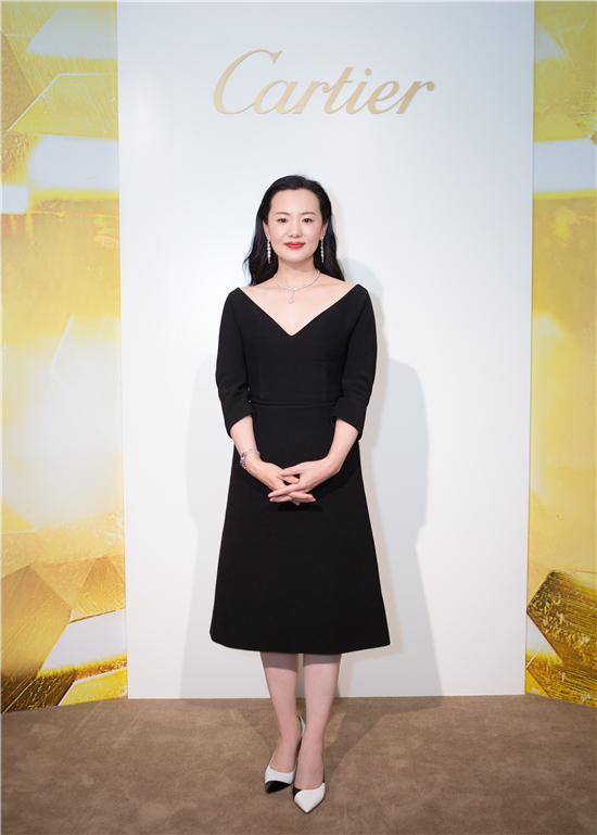 图11-14:知名演员咏梅出席晚宴,佩戴卡地亚高级珠宝系列APOGEE项链、卡地亚高级珠宝系列L’Odyssée de Cartier 钻石耳环、卡地亚Tutti Frutti水果锦囊风格手镯